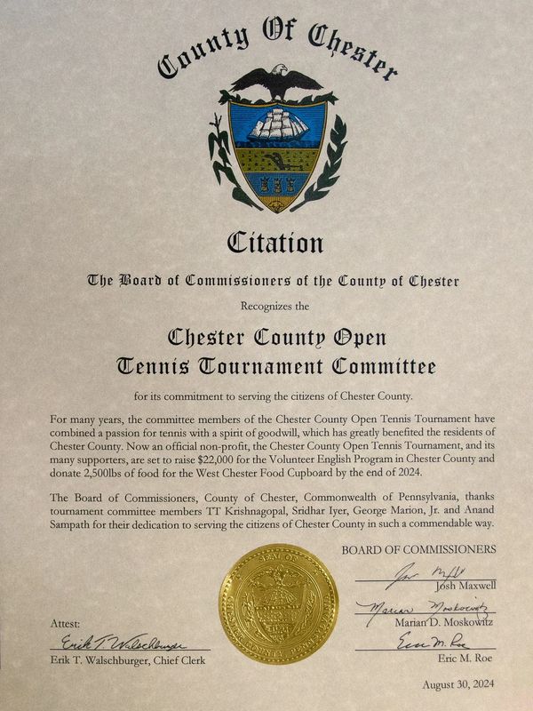 Certificate of Recognition from Chester County Commissioner Eric Roe-